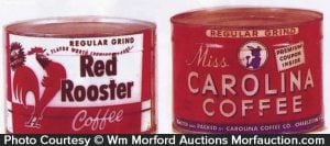 Key-Wind Coffee Cans: Lot consists of two full, never opened one pound key wind coffee tins, both w/ attached keys. Includes: Red Rooster Coffee Tin value stores; (Hopkins, Minnesota) and Miss Carolina; (Carolina Coffee Co., Charleston). Both have good color and display well although there is some light oxidizing and scattered wear on each (C. 7.5/+).