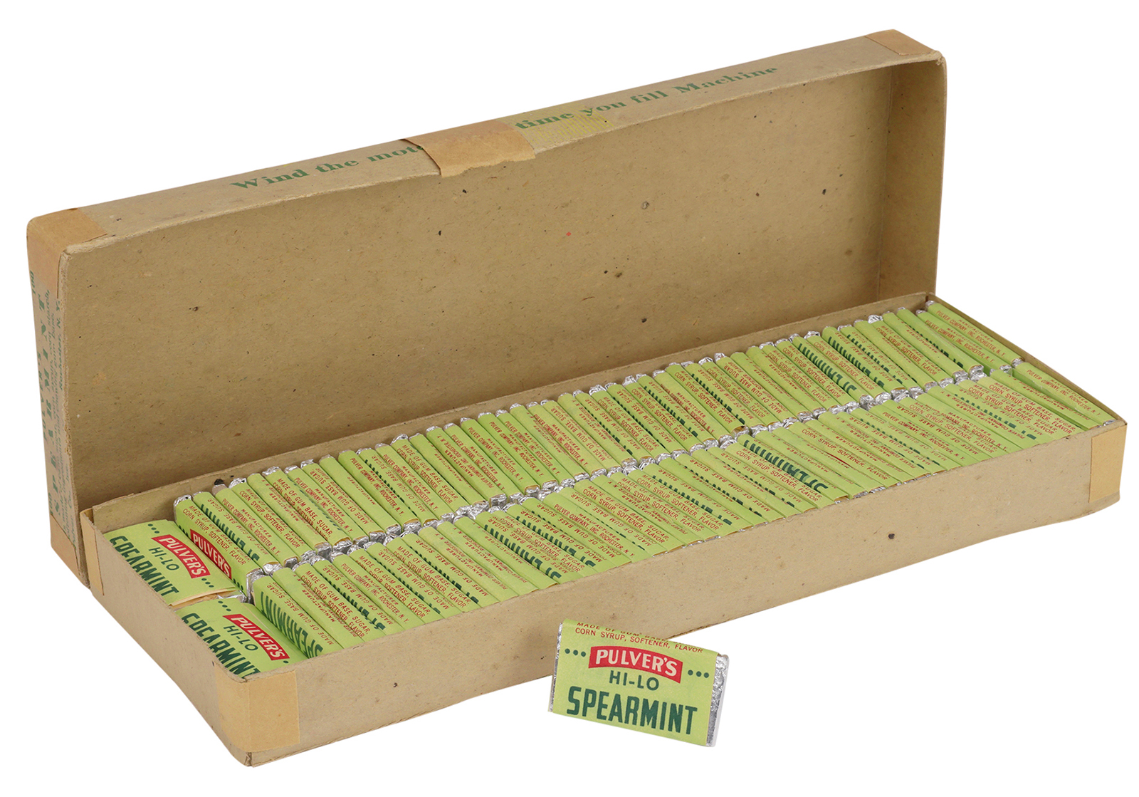 Almost complete box (contains 99/100) of its 1 cent mini vending machine tab sticks of Pulver Co.’s vintage “Hi-Lo” brand spearmint individually wrapped chewing gum. Clean and excellent. Note: these packets work and display great in several of the early mechanical penny wall vending machines.