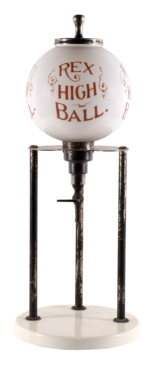 Unusual, early, very high quality fancy dispenser for ?Rex High Ball”. Has heavy ceramic base; silver plated metal supports, body and lid; w/ three repeating advertisements around sides of its round milk glass dispenser bowl. Excellent and all original, w/ some expected tarnishing and wear to silver plating in metal areas.